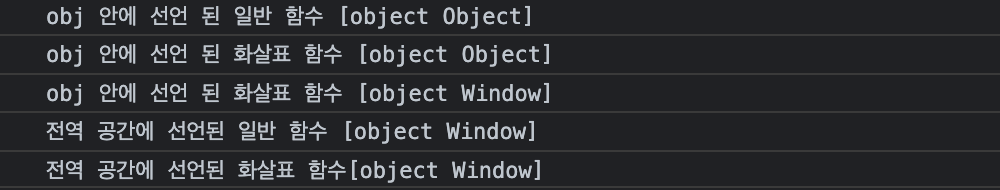 console.log("obj 안에 선언 된 화살표 함수 " + this);